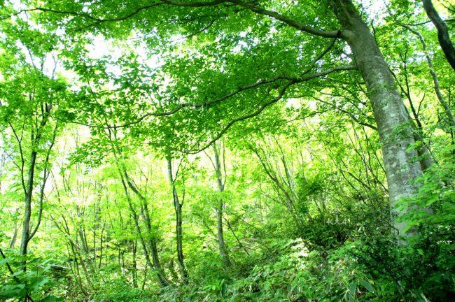 大宮町の「内山ブナ林」は、北近畿最大のブナ林で、標高450m以上の斜面に広がっています。ブナをはじめ、カエデやケヤキなど約300種類の植物が自生する自然の宝庫です。近畿のブナ林は標高600m以上に分布しますが京丹後市では積雪量の関係から標高400m付近にも自生しています。高山(標高702m)山頂から少し下った標高680m地点に立地する「内山の大ブナ」は京都府下で一番大きいブナの木で、胸高幹周3.65m・樹高32m・推定樹齢約350年。森林浴体験で身も心もリフレッシュ!