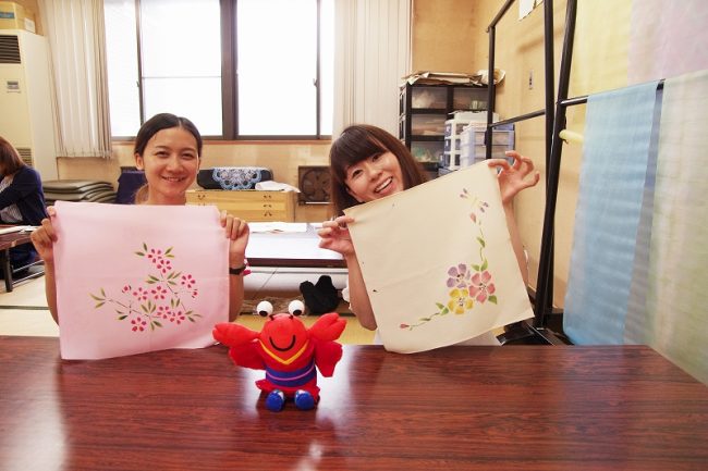 ステンシルプリントの技法で丹後ちりめんのハンカチに染色が楽しめます。