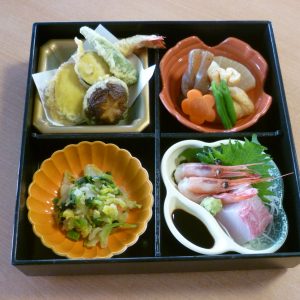 和食:松花堂弁当(刺身、天ぷら、煮物、和え物、ごはん、みそ汁、漬物)