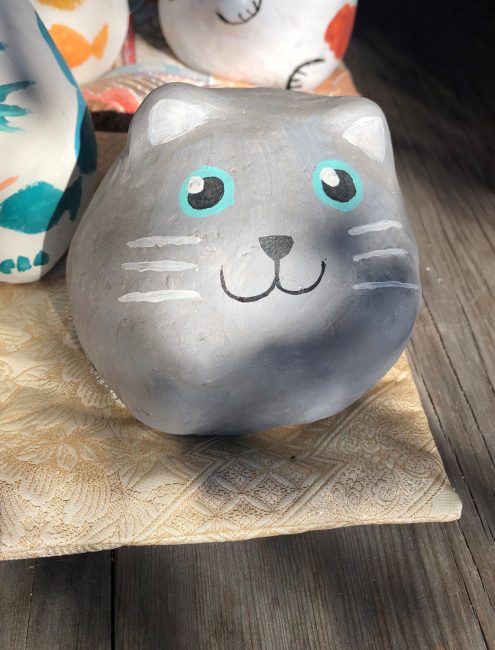 ②素焼きのこま猫にアクリル絵の具でペインティング。