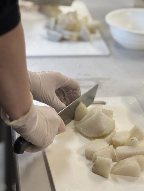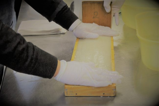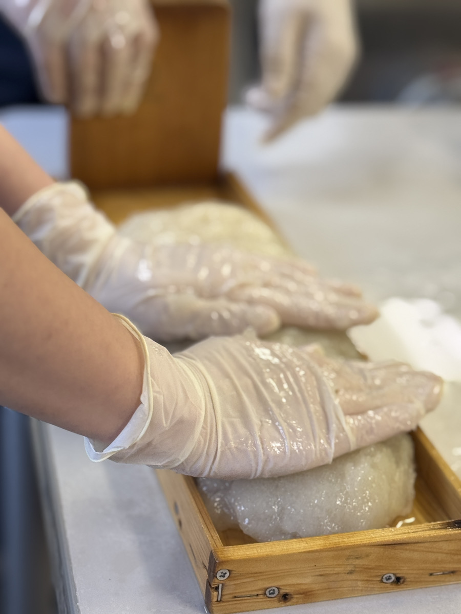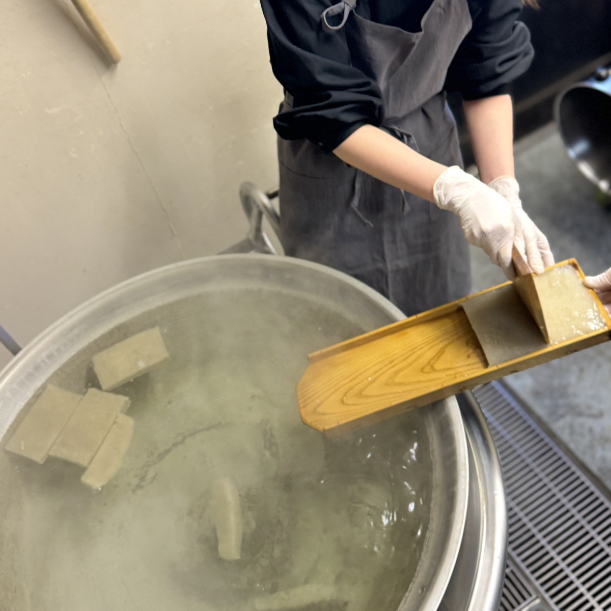 茹でた芋から板こんにゃくになる過程を体験して頂き、出来立てのこんにゃくを食べることができます。1型につき5丁分(200g×5枚分)作れます。
