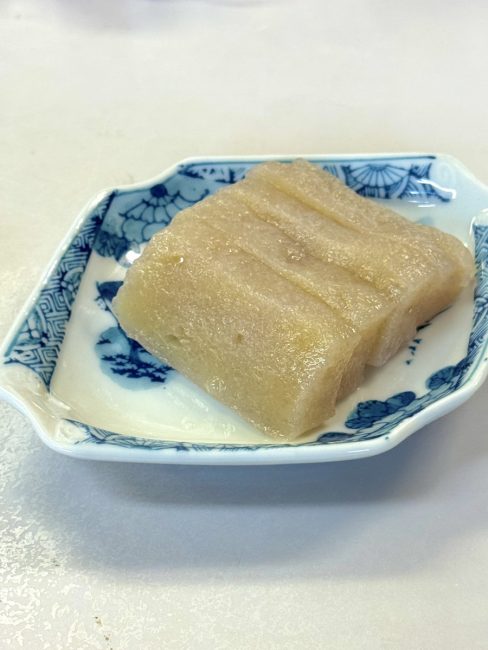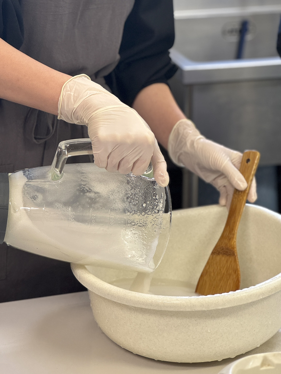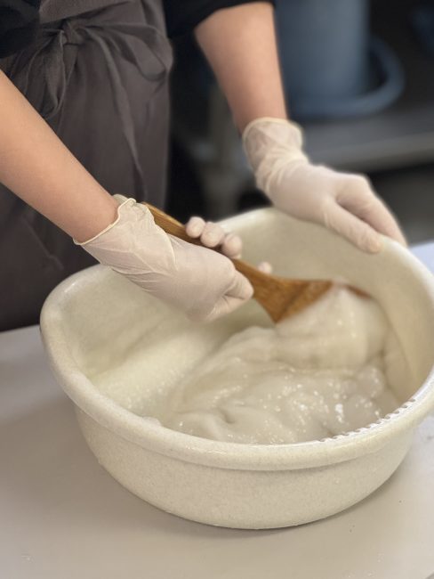①茹でたこんにゃく芋と水を混ぜて拡散して練る。