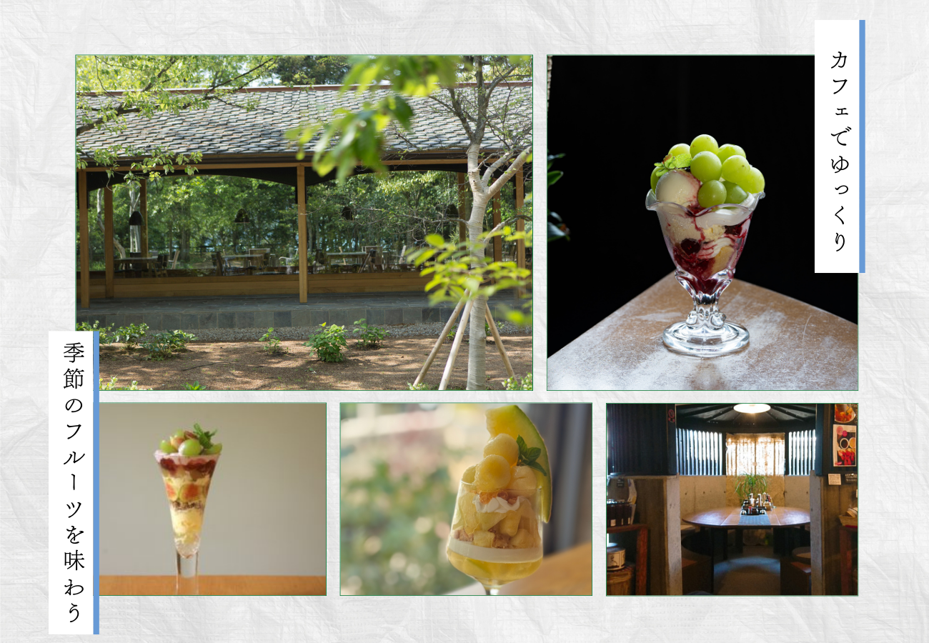 果実そのものを食べるのももちろんおいしいけれど、新鮮なフルーツを使ったスイーツは見た目も味も最高です。おなかいっぱい食べたあとは、直売所で気に入ったフルーツを買って、美味しい思い出のおすそ分け。