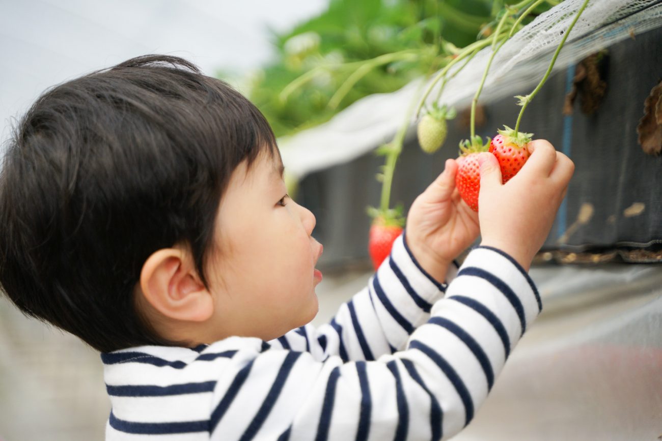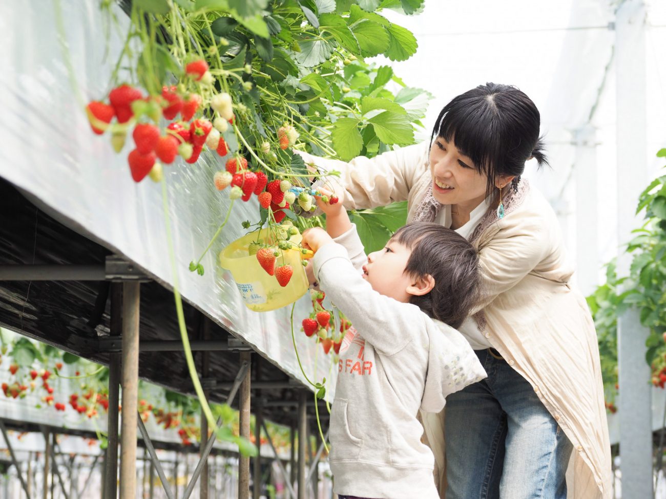 高設栽培なので立ったまま摘み取ることができ、小さなお子さま連れでも快適に体験できます。