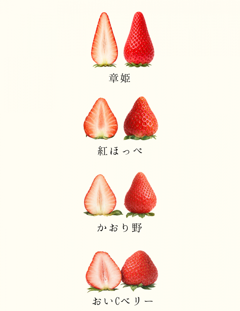 紅ほっぺ・おいCベリー・章姫・かおり野など、苺4種類の食べ比べが楽しめます。