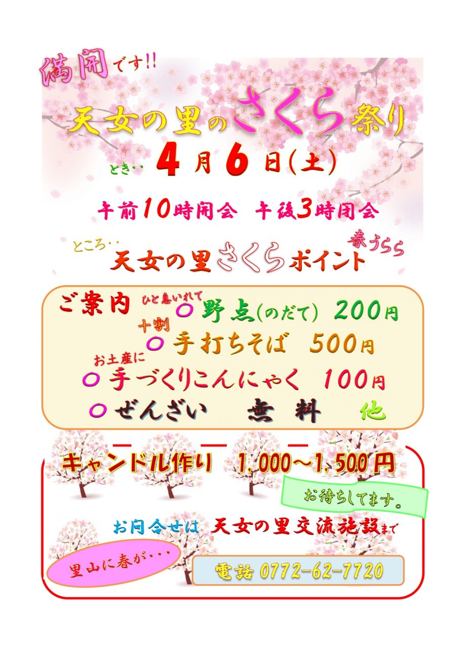 イベント情報 イベント一覧 カレンダー表示 2019年4月6日 10:00 AM – 5:00 PM 天女の里のさくら祭り 開催日: 2019年4月6日 会 場: 天女の里 (〒627-0053 京都府京丹後市峰山町鱒留1642) のどかな里山の風景を楽しめる天女の里で さくら祭りが開催されます。ぜんざいのふるまいや 手づくりソバ、こんにゃくの販売や各露店があります。