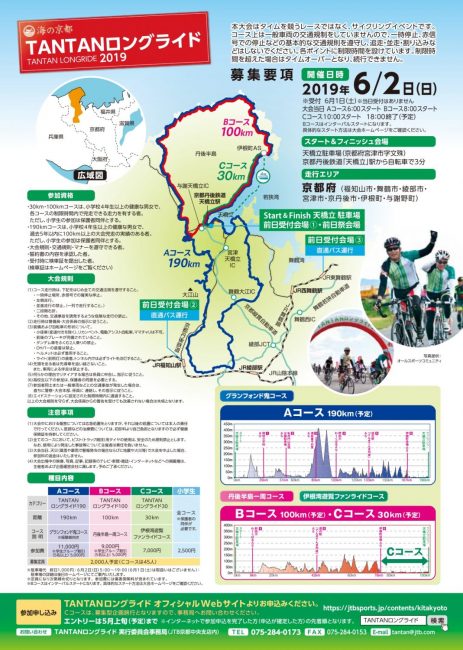 イベント情報 イベント一覧 カレンダー表示 2019年6月2日 TANTANロングライド 開催日: 2019年6月2日 会 場: 京丹後市、宮津市、伊根町、与謝野町、綾部市、舞鶴市、福知山市 主催者:TANTANロングライド実行委員会事務局 連絡先:Tel.075-284-0173 うみ・やま・さとの雄大な景色と豊な食を楽しめるロングライド! Aコース(190km)、Bコース(100km)、Cコース(30km) ※小学生の参加は保護者の同伴が必要です。 WEBサイト