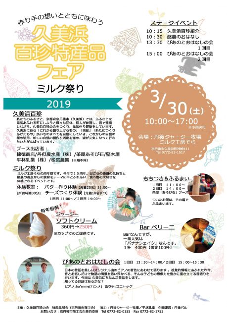 イベント情報 イベント一覧 カレンダー表示 2019年3月30日 10:00 AM – 5:00 PM 久美浜百珍特産品フェア2019 開催日: 2019年3月30日 会 場: 丹後ジャージー牧場 ミルク工房そら (〒629-3441 京都府京丹後市久美浜町神崎411) 「久美浜のええもん」特産品フェアでは久美浜百珍認定商品の試食・販売・展示などがあります。ワークショップも開催され、パターづくり体験や酪農体験学習なども体験できます。開催時間10:00~17:00
