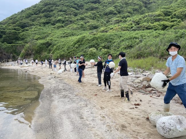 困難と思われる、水晶浜のゴミの問題を、みんなのチカラを合わせて『バケツリレー』で搬送します。