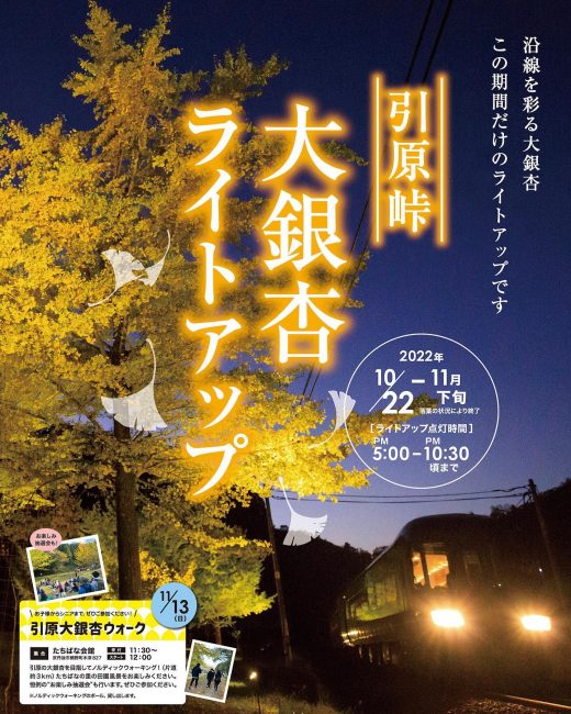 イベント情報 イベント一覧 カレンダー表示 2022年10月22 – 11月20日 引原峠大銀杏ライトアップ2022 開催日: 2022年10月22日 - 2022年11月20日 会 場: 引原峠(中央子午線塔付近) (京丹後市網野町木津) 主催者:楽夕会(らくゆうかい) 連絡先:Tel.0772-74-9350(夕日ヶ浦観光協会) 沿線を彩る大銀杏 この期間だけのライトアップです 日程:2022年10月22日(土)~11月下旬(※落葉の状況により終了) 時間:午後5時~午後10時30分頃 場所:京丹後市網野町 引原峠(国道178号線 中央子午線塔付近) WEBサイト