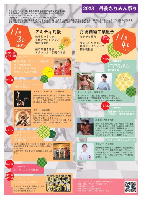 網野中学校ブラスバンド部演奏/京丹後市長挨拶/禊の会talk&movie/丹後ちりめん小唄躍り/アートパフォーマンス/キモノファッションショー/シーラ・クリフ氏 講演/キモノdeディスコ!(チケット制)/繭の糸引き体験・ステンシル・手織り体験