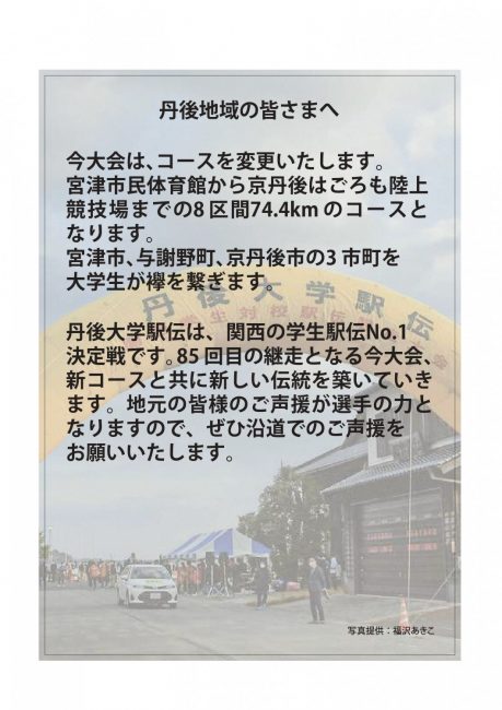 今大会は、宮津市民体育館から京丹後はごろも陸上競技場までの8区間74.4kmにコースが変更されます。