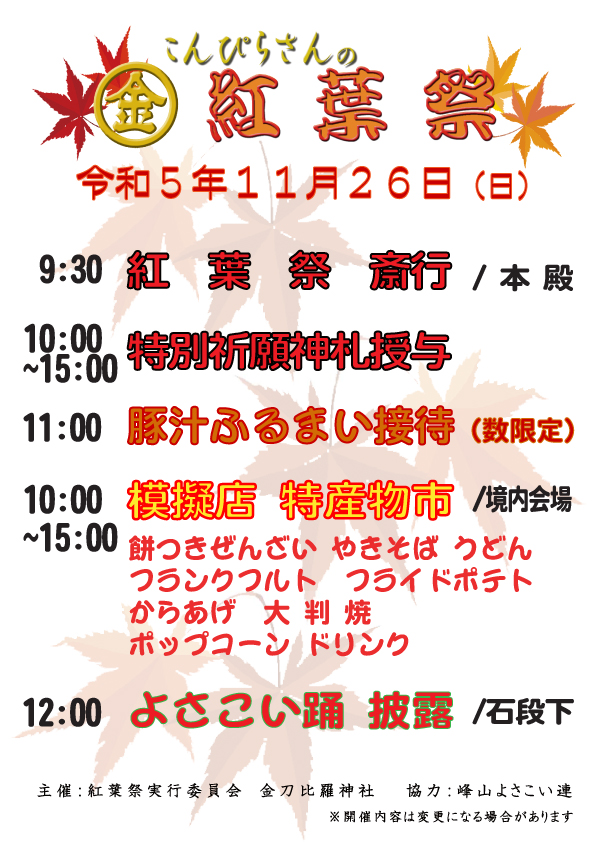 イベント情報 イベント一覧 カレンダー表示 2023年11月26日 9:30 AM – 3:00 PM こんぴらさんの紅葉祭 開催日: 2023年11月26日 会 場: 金刀比羅神社 (京都府京丹後市峰山町泉1165-2) 主催者:紅葉祭実行委員会(金刀比羅神社) 連絡先:Tel.0772-62-0225 紅葉で境内が彩られるこの時季を選び、各ご家庭の安全、年末の防災・防火の祈念に併せ、紅葉祭が行われます。 豚汁のふるまい(数限定)のほか、模擬店や特産物市などあります。 WEBサイト