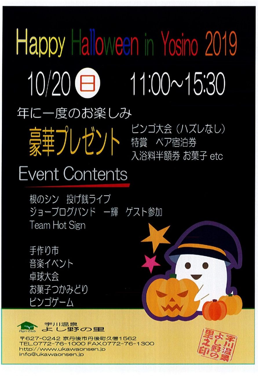 イベント情報 イベント一覧 カレンダー表示 2019年10月20日 11:00 AM – 3:30 PM Happy Halloween in Yosino 2019 開催日: 2019年10月20日 会 場: 宇川温泉よし野の里 (京丹後市丹後町久僧1562) 主催者:宇川温泉よし野の里 連絡先:Tel.0772-76-1000 手作り市や盛り上がるライブ、卓球大会や、ハズレなしのビンゴ大会などが開催されます。 WEBサイト
