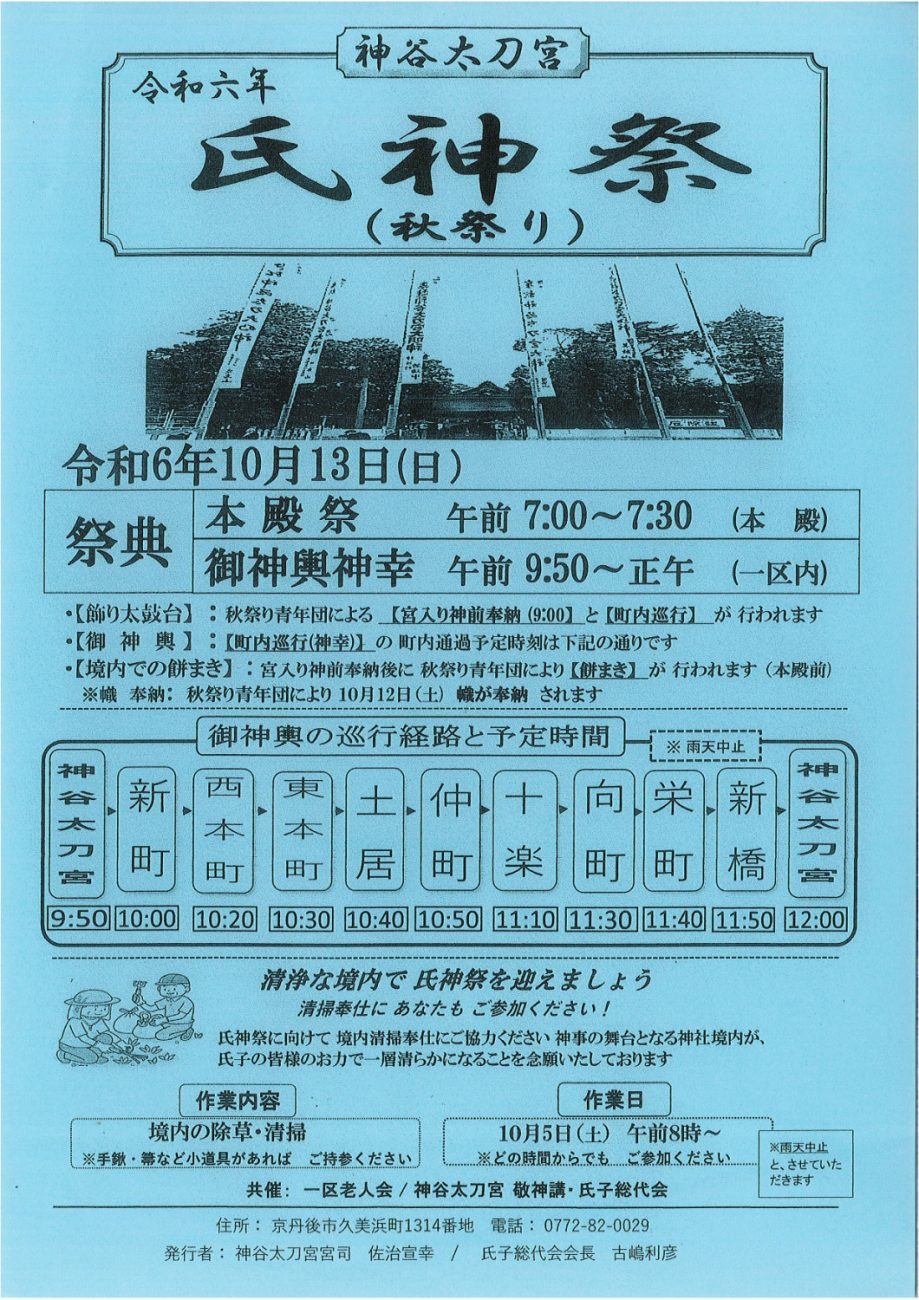 京丹後市久美浜町にある神谷太刀宮で、秋祭り『氏神祭』が開催されます。