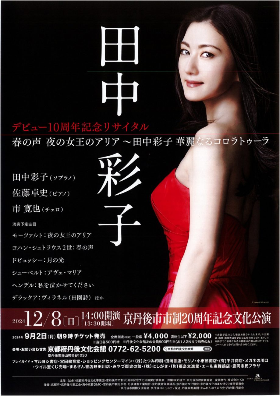 2024年12月8日(日)京都府丹後文化会館にて、京丹後市市制20周年記念文化公演『田中 彩子 デビュー10周年記念リサイタル』春の声 夜の女王のアリア~田中 彩子 華麗なるコロラトゥーラが開催されます。