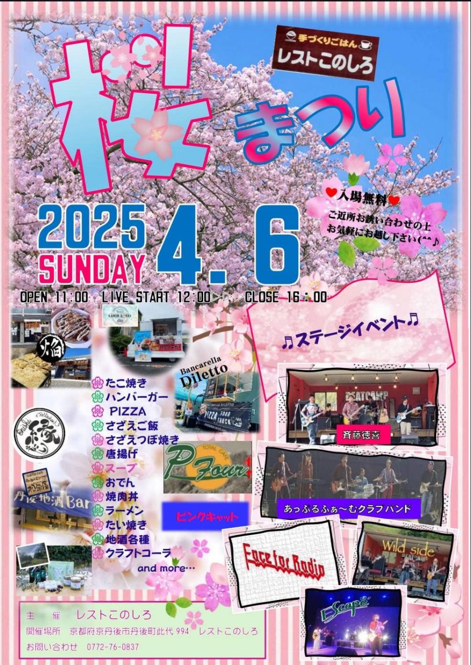 桜まつりではキッチンカーが多数出店し、12:00からはLIVEイベントもお楽しみいただけます。