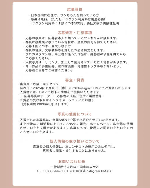 西日本最大級の道の駅・丹後王国「食のみやこ」にて、わんちゃんフォトコンテストが開催されます。