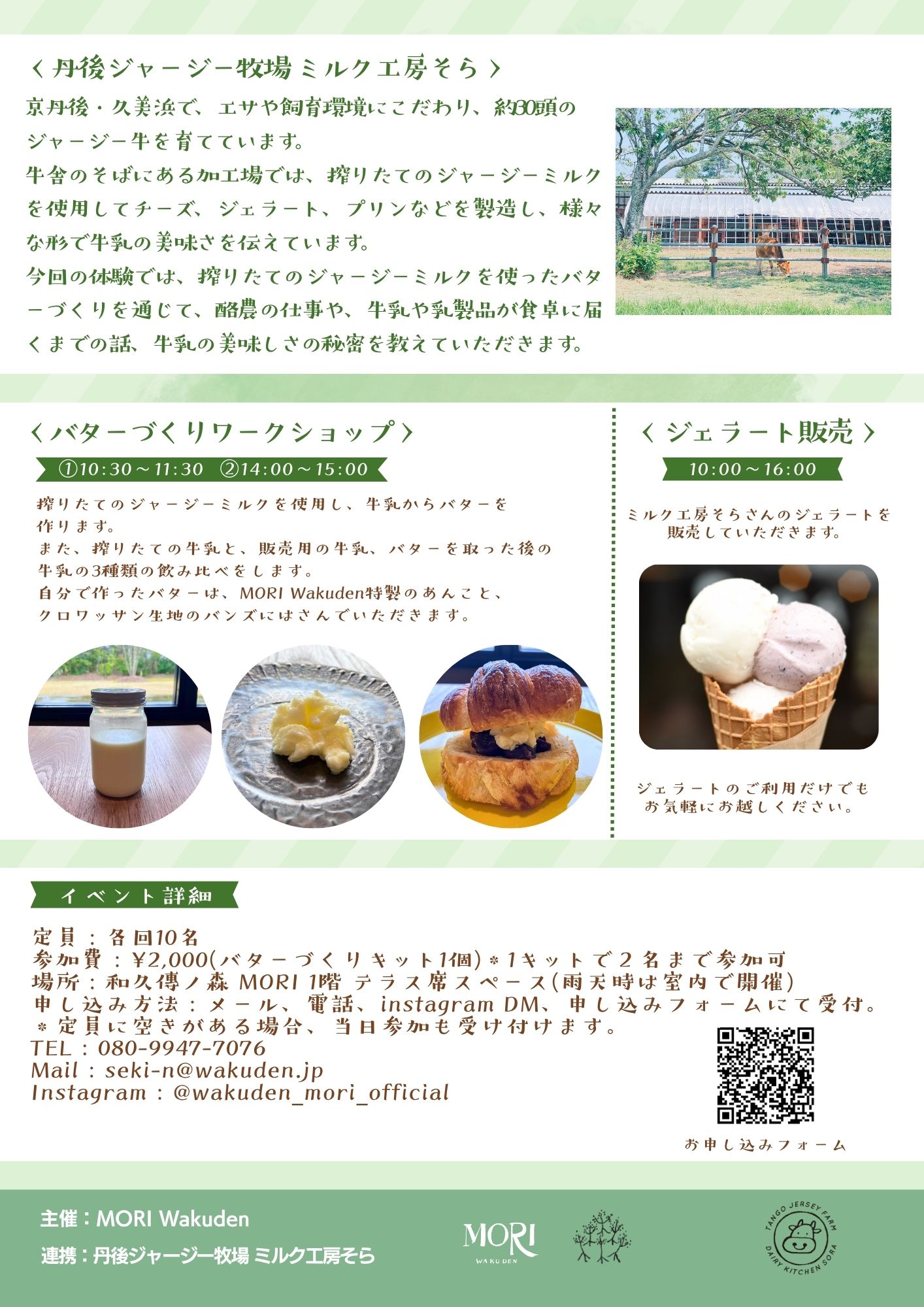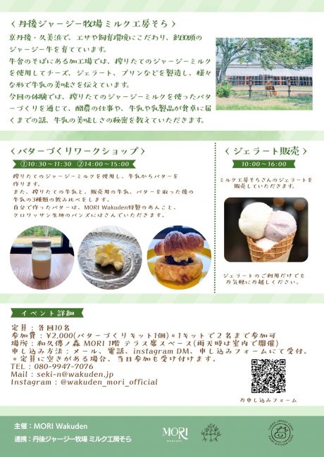 今回は、「丹後ジャージー牧場ミルク工房そら」とのコラボレーション企画として、搾りたてのジャージーミルクを使用したバターづくりワークショップを実施します。