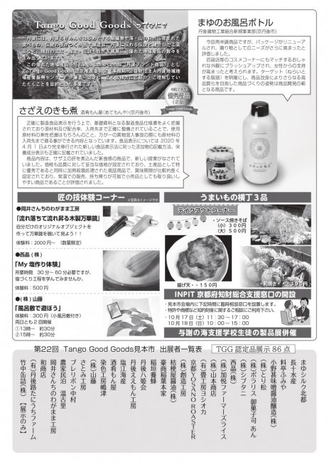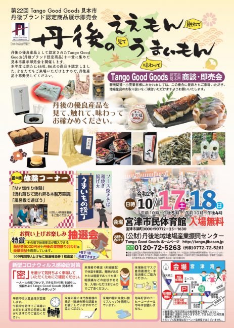 イベント情報 イベント一覧 カレンダー表示 2020年10月17 – 18日 丹後のええもんうまいもん-丹後ブランド認定商品展示即売会- 開催日: 2020年10月17日 - 2020年10月18日 会 場: 宮津市民体育館 (京都府宮津市浜町3000) 主催者:(公財)丹後地域地場産業振興センター 連絡先:Tel.0120ー72ー5263 第22回 Tango Good Goods 見本市 丹後ブランド認定商品展示即売会 「丹後のええもんうまいもん」が開催されます。 WEBサイト