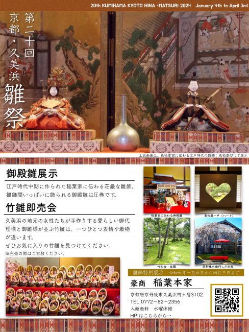 ○御殿雛展示 江戸時代中期に作られた稲葉家に伝わる荘厳な雛飾。 雛飾間いっぱいに飾られる御神殿は圧巻です。 ○竹雛即売会 久美浜の地元の女性たちが手作りする愛らしい御内裏様と御雛様が並ぶ竹雛は、一つひとつ表情や着物が違い […]