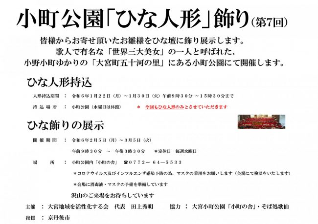 ”世界三大美女”の一人と呼ばれた小野小町ゆかりの地、大宮町五十河の里にある小町公園で「ひな人形飾り」が開催されます。 ◆ひな人形持ち込み 期間 2024年1月22日(月)~1月30日(火) 時間 9:30~15:30 場 […]