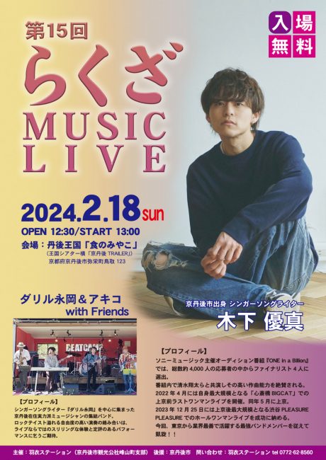 道の駅 丹後王国「食のみやこ」内にある丹後初のライブハウス”京丹後TRAILER”で、第15回らくざMUSIC LIVEが開催されます。 京丹後市出身のシンガーソングライター木下優真さんと、京丹後市在住のダリル永岡&アキ […]