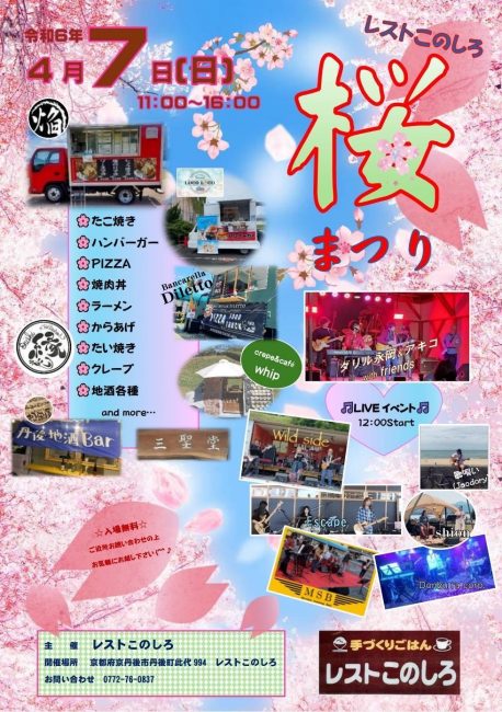 丹後の海を臨む絶景食堂「レストこのしろ」で、今年も桜まつりが開催されます。 桜まつりではキッチンカーが多数出店し、12:00からはLIVEイベントもお楽しみいただけます。 -日時- 2024年4月7日(日) 時間 11: […]
