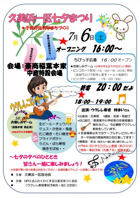 今年も豪商稲葉本家を会場に、久美浜一区七夕まつりが開催されます。 イベントでは、ドリンクやフードの販売もございます。 また、16:00からは「ちびっ子広場」でお楽しみゲームも! ウクレレ奏者の林まいさんの演奏もお楽しみい […]