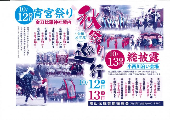 今年も京丹後市峰山町にある金刀比羅神社で、宵宮祭りが2日間にかけて行われます。 10月12日(土) -宵宮祭り- ①18:20~ 金刀比羅山 ②18:40~ 峰山よさこい連 ③19:00~ 峰山子供おどり ④19:20~ […]