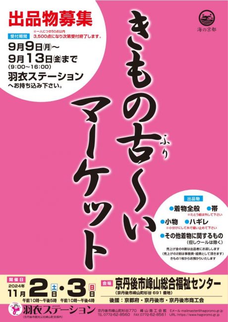 羽衣ステーションにて、「きもの古~いマーケット」が開催されます。 ◆日時 2024年11月2日(土) 時間 10:00~17:00 2024年11月3日(日) 時間 10:00~16:00 場所 京丹後市峰山総合福祉セン […]