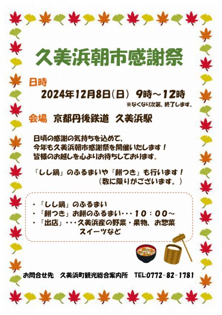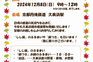 日頃の感謝の気持ちを込めて、今年も久美浜朝市感謝祭が開催されます。 今年は、『しし鍋』の振る舞いや『餅つき』もお楽しみいただけます。※数量限定 〇日時 2024年12月8日(日) 時間 9:00~12:00 ※なくなり次 […]