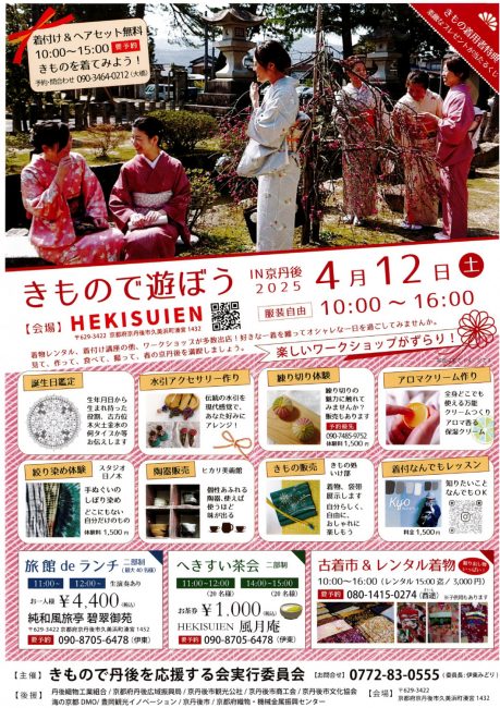 久美浜湾を臨むHEKISUIENを会場にイベントが開催されます。 着物レンタル、着付け講座のほか、ワークショップが多数出店! 見て、作って、食べて、撮って、春の京丹後を満喫してみてはいかがでしょうか。 〇開催日時 202 […]