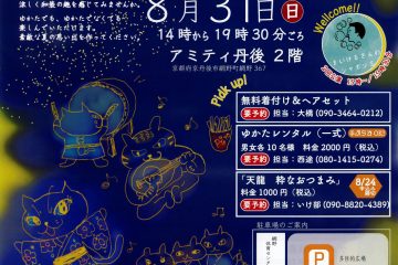 アミティ丹後で和装を楽しむイベント「ゆかたノオト」が開催されます。 もし浴衣を持っていなくても、レンタルや着付けも行っているので手ぶらでOK! 抽選会にも参加できるので、ぜひ浴衣や甚平を着て夏の終わりのイベントをお楽しみ […]