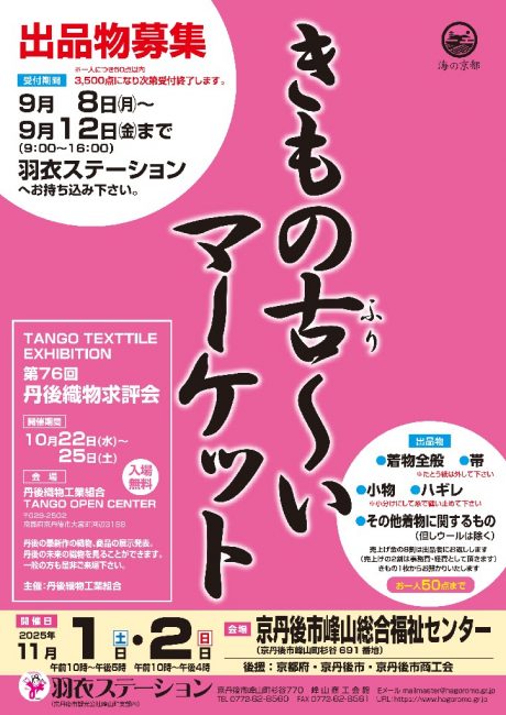 羽衣ステーションにて、「きもの古~いマーケット」が開催されます。 ◆日時 2025年11月1日(土) 時間 10:00~17:00 2025年11月2日(日) 時間 10:00~16:00 場所 京丹後市峰山総合福祉セン […]