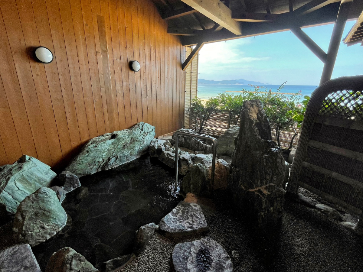 “美人の湯”として知られる夕日ヶ浦の天然温泉の露天風呂も自慢のひとつ。