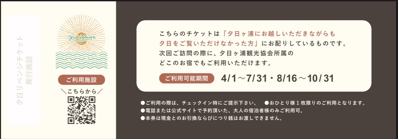 「夕日リベンジチケット」の対象施設は、夕日ヶ浦観光協会ホームページでご確認ください。
