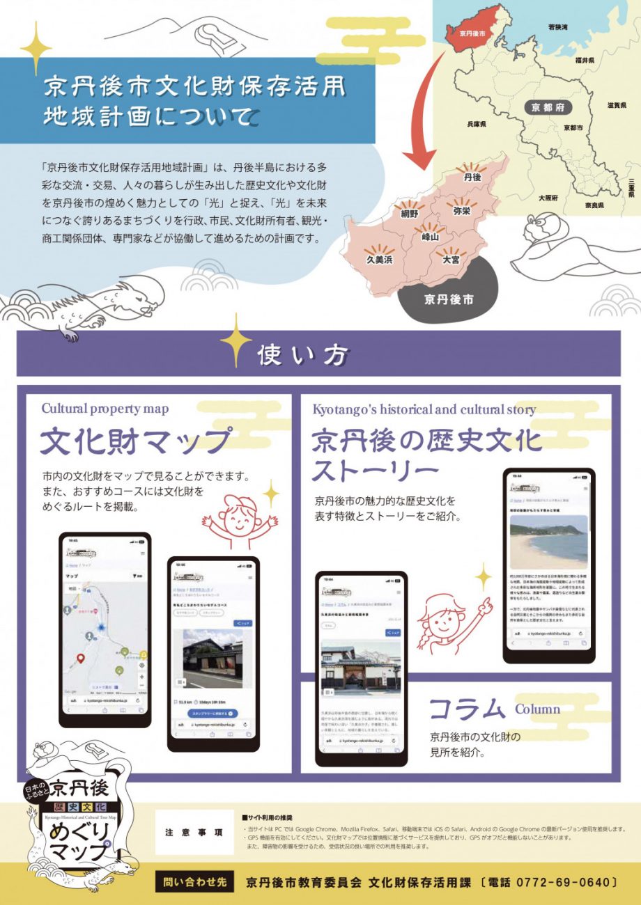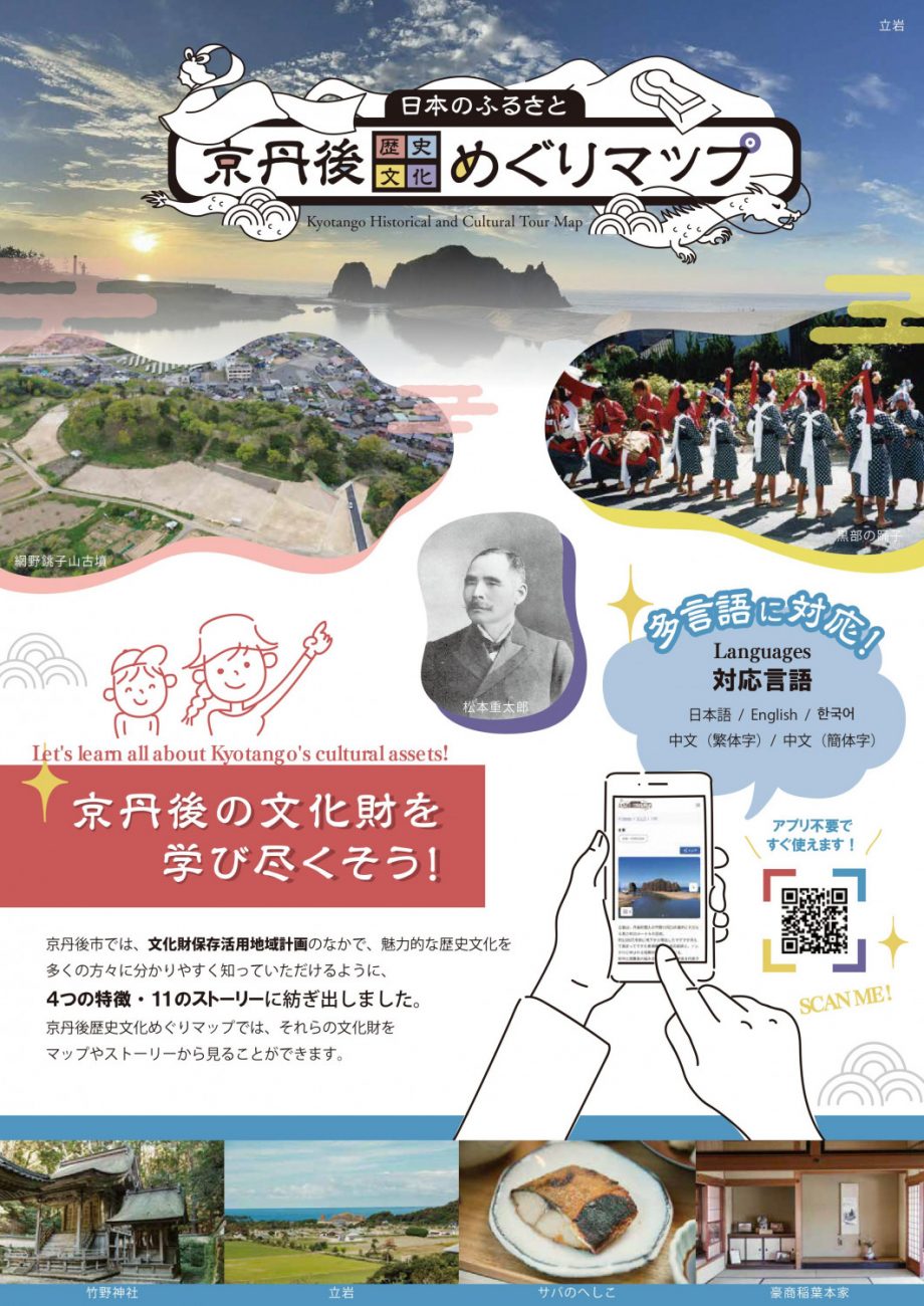 注目情報 2024.04.15|お知らせ 京丹後の歴史文化を周遊する「京丹後歴史文化めぐりマップ」公開 京丹後歴史文化めぐりマップちらしダウンロード 京丹後市は、京丹後の歴史文化を、市内外の多くの方々に知っていただくとともに周遊していただけるよう、スマートフォンやタブレットを使って自宅でも現地でも楽しむことができるウェブサイト「京丹後歴史文化めぐりマップ」を公開しました。京丹後の歴史文化ストーリーが紹介されており、コラムでは京丹後の文化財の見どころも。また、文化財の位置がマップ上に表示されるため周遊にも便利です。ぜひご覧ください。(下記チラシをクリックするとウェブサイトをご覧いただけます。) 投稿ナビゲーション ビーチブランコゆらり一時撤去についてカラダもココロも健康になれる「海の京都」京丹後ヘルスツーリズム