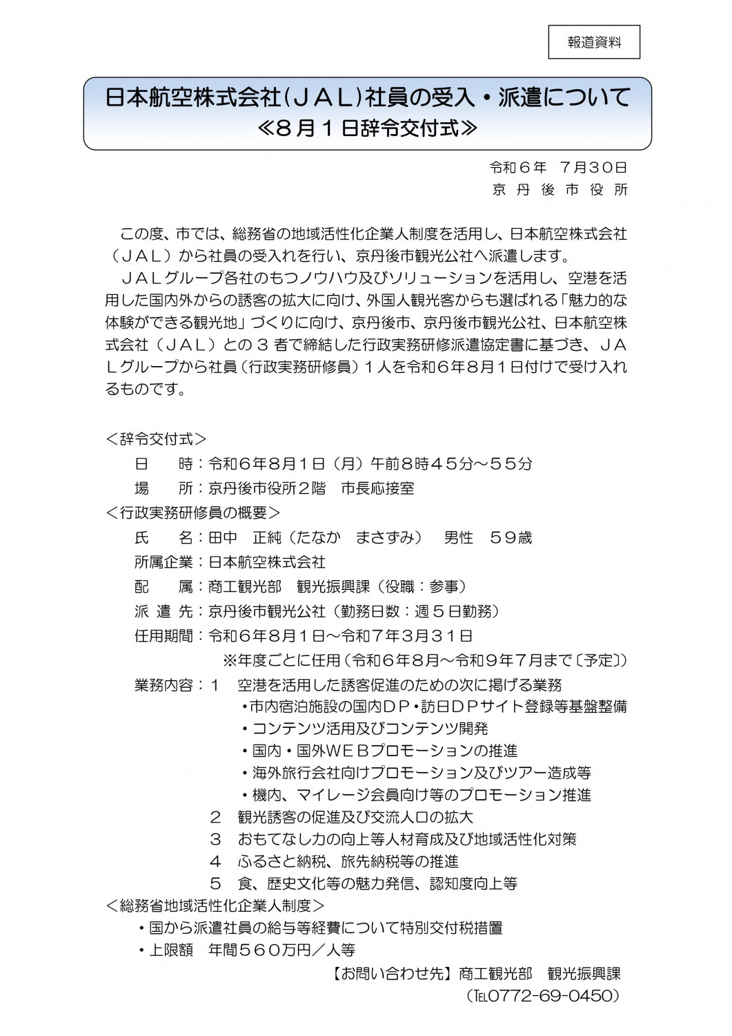 注目情報 2024.08.05|お知らせ 日本航空株式会社(JAL)社員の受入・派遣について≪8月1日辞令交付式≫ 報道資料2024.7.30 日本航空株式会社(JAL)社員の受入・派遣について≪8月1日辞令交付式≫ダウンロード 投稿ナビゲーション 京都駅ー京丹後市直通高速バスの実証運行について~2024ハッシュタグキャンペーン~『#京たんごフルーツ』を開催します