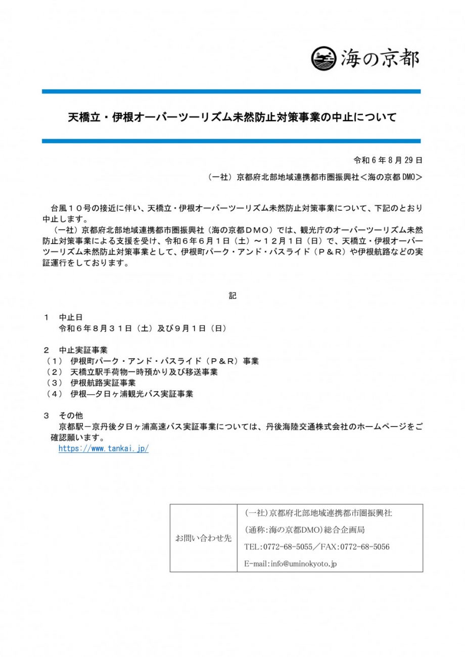 注目情報 2024.08.29|お知らせ 台風10号接近に伴う『伊根~夕日ヶ浦観光バス実証事業』等の中止について 台風10号の接近に伴い、8月31日(土)及び9月1日(日)の下記事業は中止となりますので、ご注意ください。 (1) 伊根町パーク・アンド・バスライド(P&R)事業(2) 天橋立駅手荷物一時預かり及び移送事業(3) 伊根航路実証事業(4) 伊根―夕日ヶ浦観光バス実証事業 丹後海陸交通株式会社HPはこちら 投稿ナビゲーション 経ヶ岬灯台敷地内への一部立ち入り禁止についてKyoto Health Resort 京丹後 韓国視察・プロモーション訪問