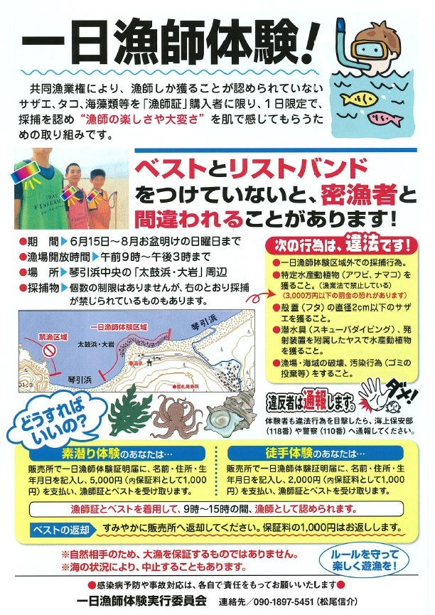 共同漁業権により、漁師しか獲ることが認められていないサザエ・タコ・海藻類等を「漁師証」購入者に限り、1日限定で採捕を認め ”漁師の楽しさや大変さ” を肌で感じてもらうための取り組みです。