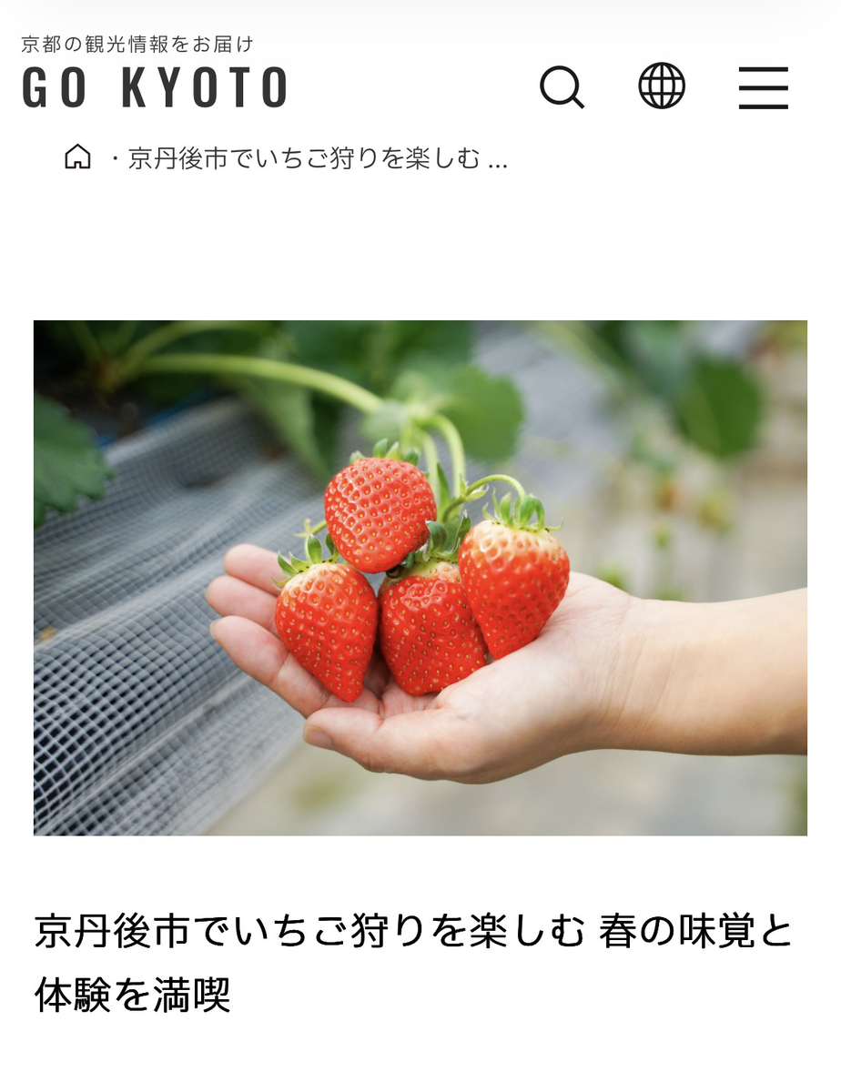 注目情報 2026.04.07|お知らせ 観光情報サイト「GO KYOTO」に京丹後市内のいちご狩り体験が掲載されました 京都府内の観光情報を発信する「GO KYOTO」に、京丹後市が掲載されましたのでお知らせいたします。サイトでは京丹後市内で開催されているいちご狩り体験をはじめ、春のおすすめ観光スポットなどをご紹介いただきました。 「GO KYOTO」を是非ご覧ください。 投稿ナビゲーション ガンダムマンホールカードの配布が再開されます