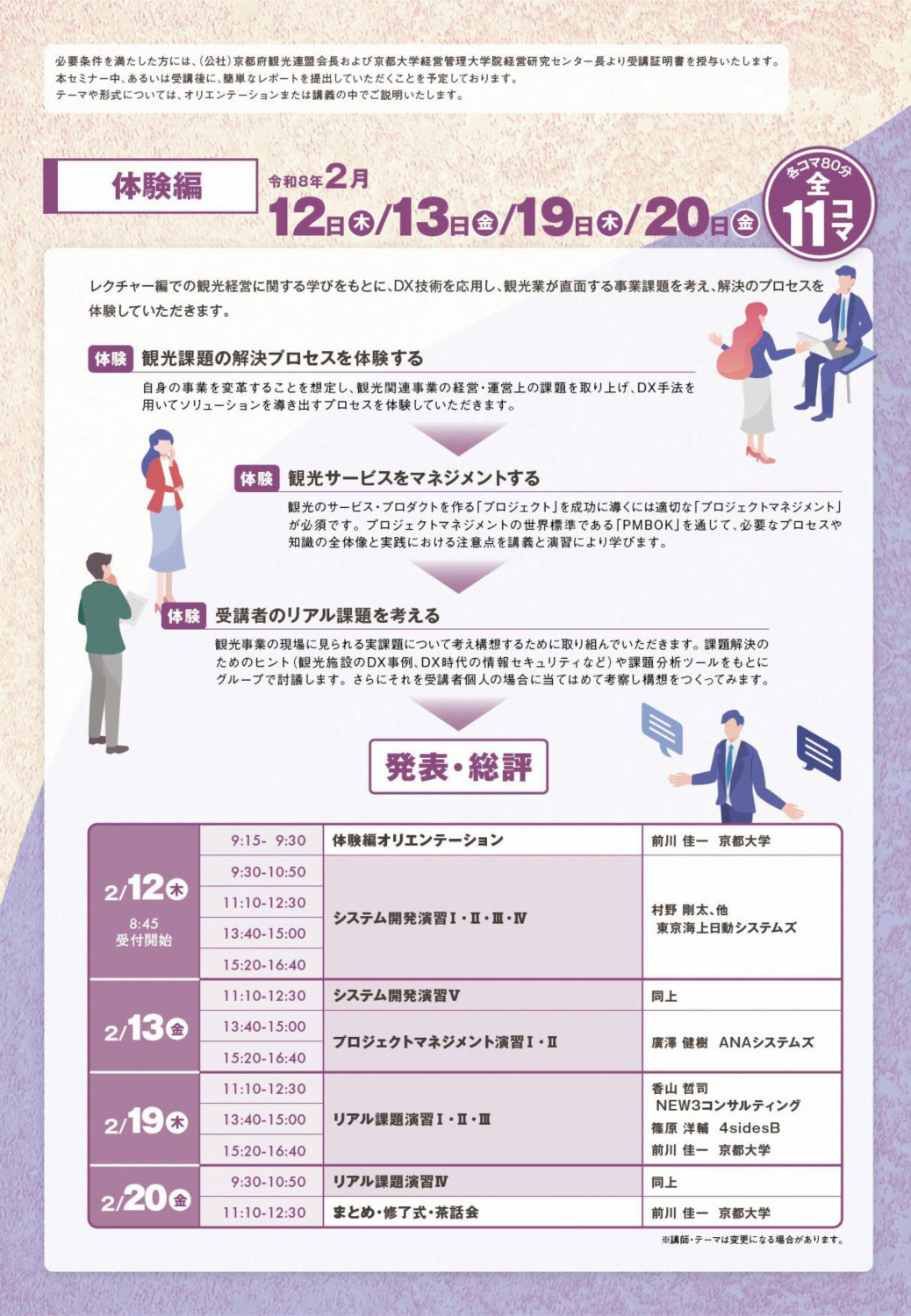 - レクチャー編:8月7日(木)8日(金)、25日(月)、26日(火)全15コマ(各コマ80分)、体験編:令和8年2月12日(木)、13日(金)、19日(木)、20日(金) 全11コマ(各コマ80分)
