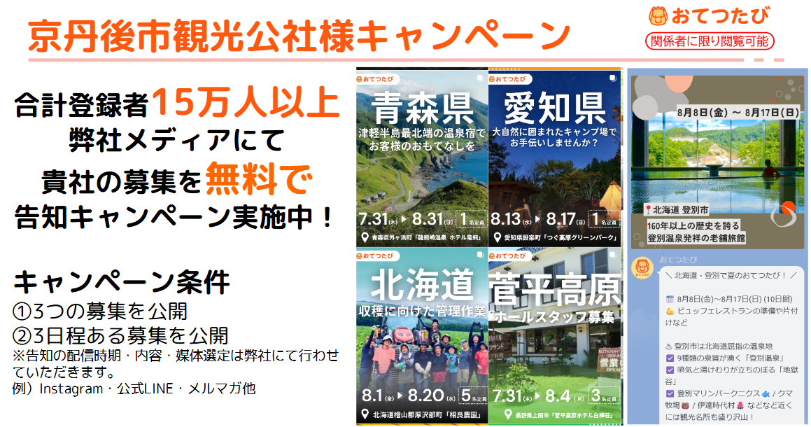 この度、15万人以上が登録するおてつたびのメディアに会員施設の募集を無料で掲載する「募集告知キャンペーン」を実施いたします。