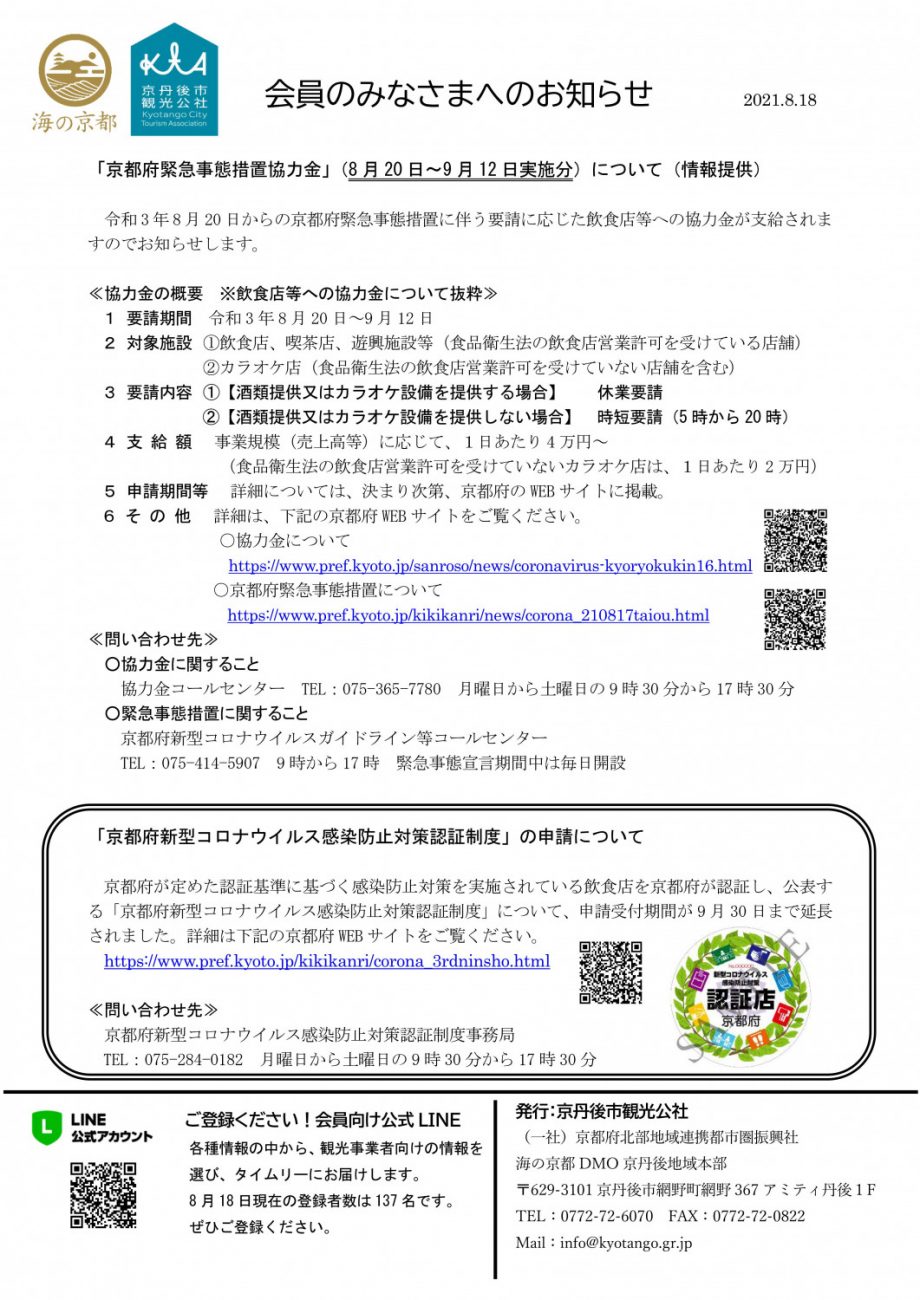 会員向けトピックス 2021.08.18 京都府緊急事態措置協力金(8月20日~9月12日実施分)について(情報提供) 0818京都府緊急事態措置協力金(8月20日~9月12日分)(情報提供)ダウンロード 投稿ナビゲーション 「飲食事業者宅配緊急支援補助金」の募集開始について「危機克服緊急連携支援補助金」第2次募集の開始について