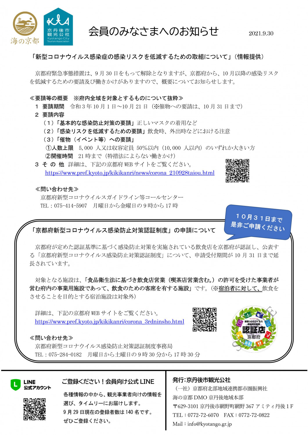 会員向けトピックス 2021.09.30 「新型コロナウイルス感染症の感染リスクを低減するための取組について」(情報提供) 0930京都府新型コロナウイルス感染症の感染リスクを低減するための取組について(情報提供)ダウンロード 投稿ナビゲーション 海の京都フードトレイル人材育成セミナー ~ロングセラー商品とブランドの作り方~ の参加者募集について「きょうと魅力再発見旅プロジェクト」参加事業者の募集について(情報提供)