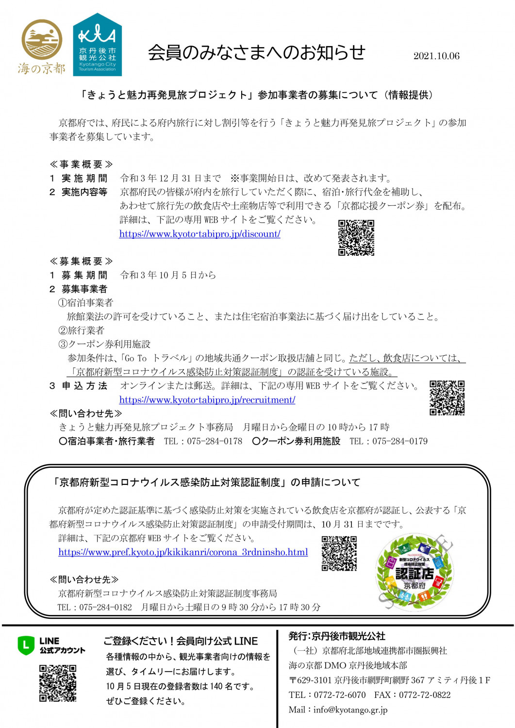 会員向けトピックス 2021.10.06 「きょうと魅力再発見旅プロジェクト」参加事業者の募集について(情報提供) 1006「きょうと魅力再発見旅プロジェクト」参加事業者の募集について(情報提供)ダウンロード 【事業者募集リリース】きょうと魅力再発見旅プロジェクト1005ダウンロード きょうと魅力再発見旅プロジェクト公式WEBサイト 投稿ナビゲーション 「新型コロナウイルス感染症の感染リスクを低減するための取組について」(情報提供)“京丹後ガストロノミカ 2021” 参加者の募集について