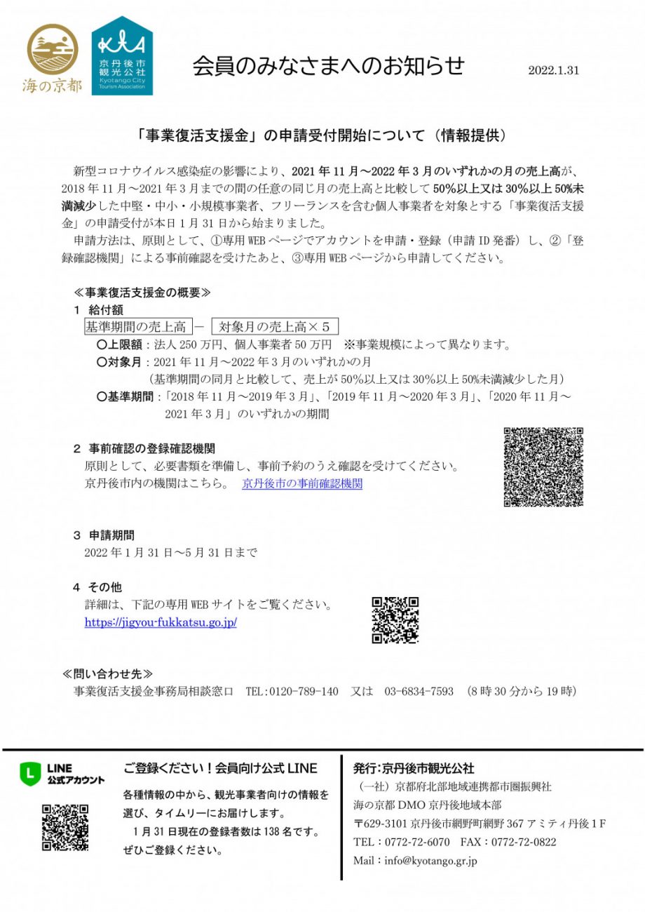 会員向けトピックス 2022.01.31 「事業復活支援金」の申請受付開始について(情報提供) 0131事業復活支援金の申請について(情報提供)ダウンロード 投稿ナビゲーション 京都府「まん延防止等重点措置協力金」(京都府全域:1月27日~2月20日実施分)について(情報提供)テレワーク・ワーケーション受入れ研修会 参加事業者の募集について