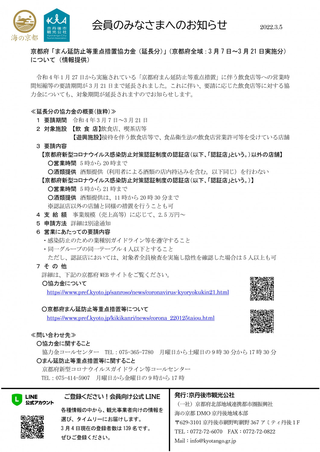 会員向けトピックス 2022.03.04 京都府「まん延防止等重点措置協力金(延長分)」(京都府全域:3 月 7 日~3 月 21 日実施分)について(情報提供) 0305 京都府「まん延防止等重点措置協力金(延長分)」について(情報提供)ダウンロード 【参考】R40304本部会議資料ダウンロード 投稿ナビゲーション 京都府「まん延防止等重点措置協力金(延長分)」(京都府全域:2 月 21 日~3 月 6 日実施分) について(情報提供)第20回(2022年)丹後100kmウルトラマラソン「オフィシャルツアー」の宿泊客受入施設の募集及び説明会の開催について