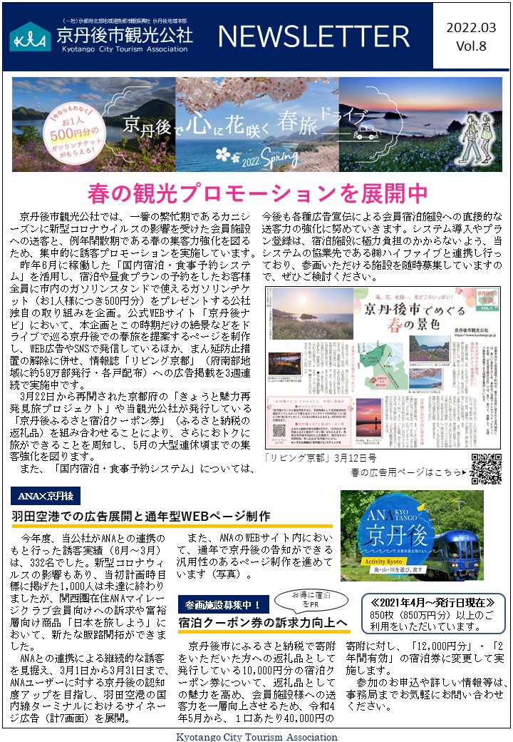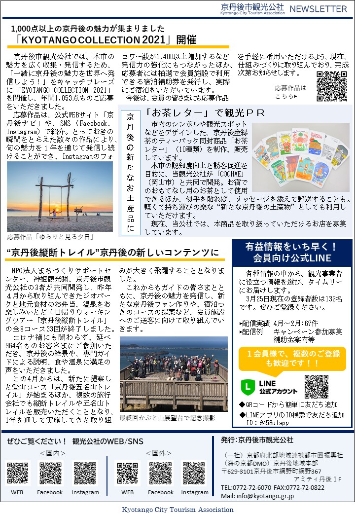 会員向けトピックス 2022.03.28 NEWSLETTER Vol.8 京丹後市観光公社ニュースレターVol.8ダウンロード 投稿ナビゲーション 観光庁補助事業「地域一体となった観光地の再生・観光サービスの高付加価値化事業」に関するお知らせ「きょうと魅力再発見旅プロジェクト」の期間延長について(情報提供)